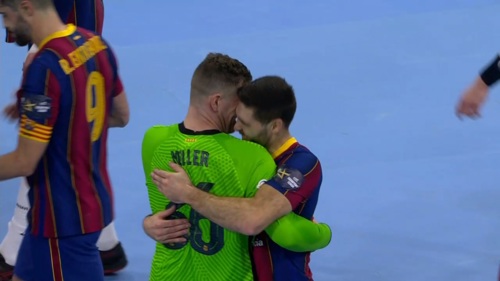 An extra hug for Barça goalkeeper Kevin Møller, who has been named Player of the Match!