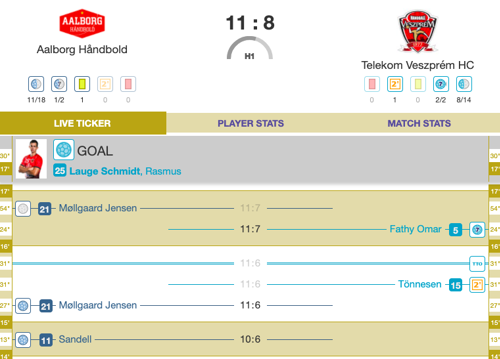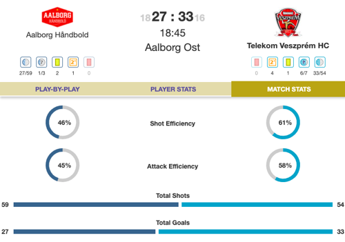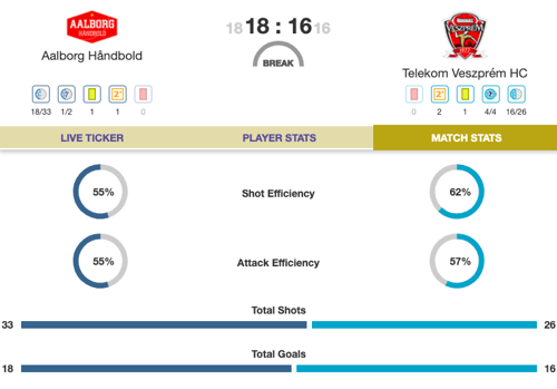 Meanwhile in Aalborg, it's a very high-scoring clash, with Aalborg leading Veszprém by two goals as the teams hit the dressing rooms.