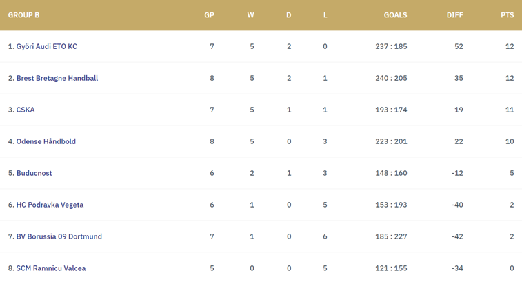 Let us have a little look at how group B is shaping up after today's result. Brest go top of the table alongside Györ but have played a game more than them and CSKA right behind them.