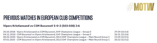 Let's take a closer look at Vipers and CSM: prior to Saturday's MOTW, the two teams have met four times in the EHF Champions League. CSM are leading the head-to-head stats with three wins, including both their main round encounters last season.