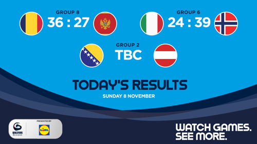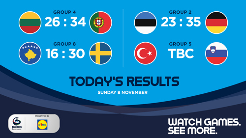 - RESULTS SUNDAY: Lithuania vs Portugal 26:34, Estonia vs Germany 23:35, Kosovo vs Sweden 16:30, Romania vs Montenegro 36:27, Italy vs Norway 24:39